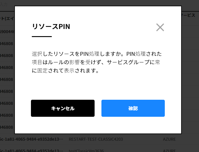 複数のリソースをPIN処理する場合、アラートポップアップが表示され、確認をクリックすると選択されたリソースがPIN処理されこれ以上ルールの影響を受けないリソースに変更されます。