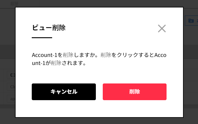 ビュー削除メニューをクリックすると、削除確認ポップアップが表示され、削除ボタンをクリックすると、選択されたビューが削除されます。