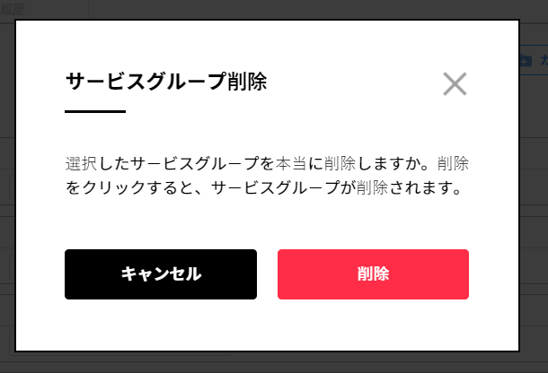 削除ボタンをクリックすると、削除確認ポップアップが提供され、削除を選択するとサービスグループが削除されます。