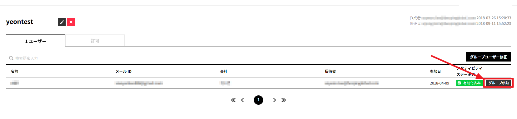 [グループ移動]機能を利用したグループユーザー変更も可能です。ユーザーグループリストで各ユーザー情報の右側にある[グループ移動]ボタンをクリックします。