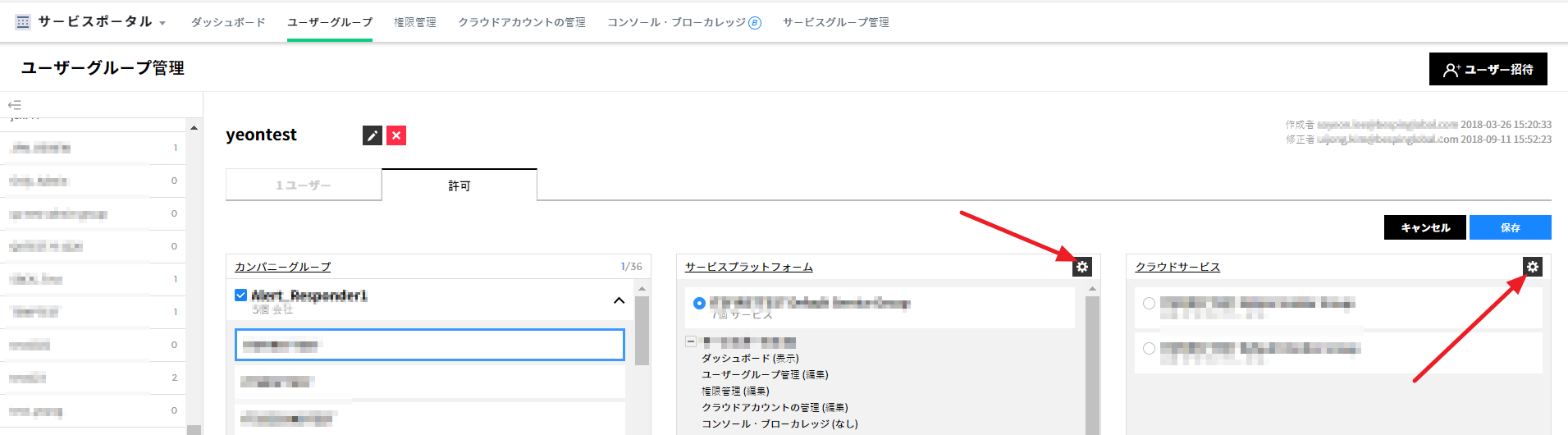 許可のカンパニーグループ、サービスプラットフォーム、クラウドはサービスポータルの権限管理メニューで設定できます。各サービスの歯車アイコンをクリックすると、該当サービスにすぐ移動します。