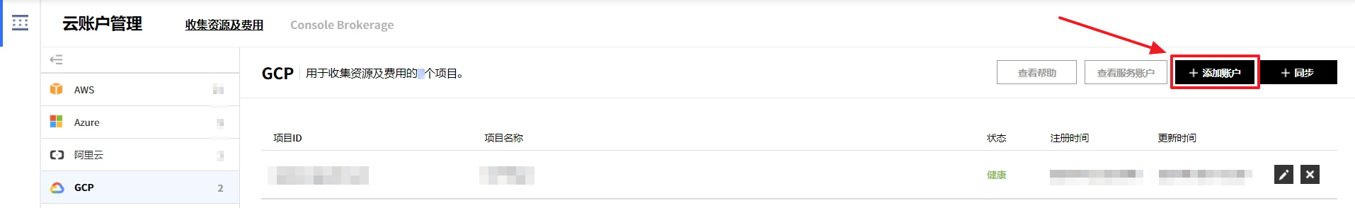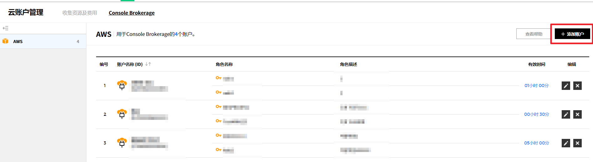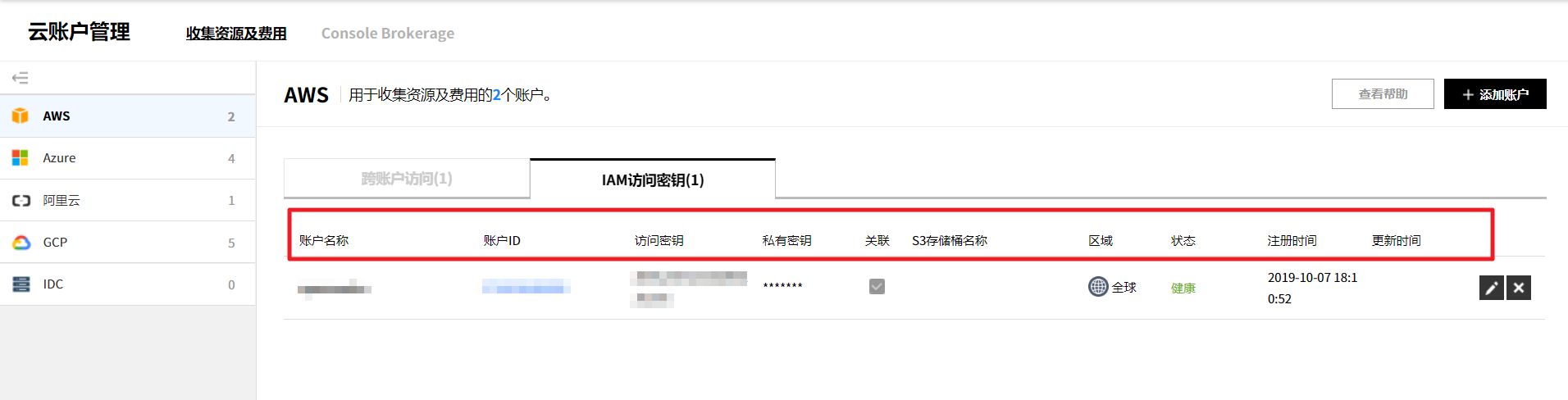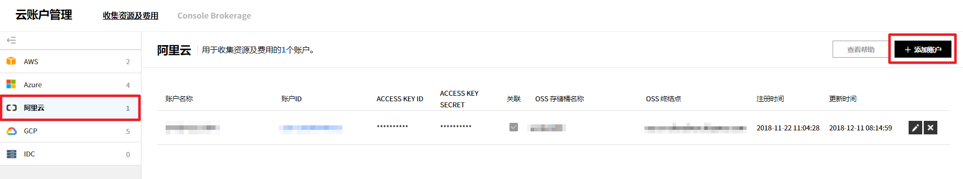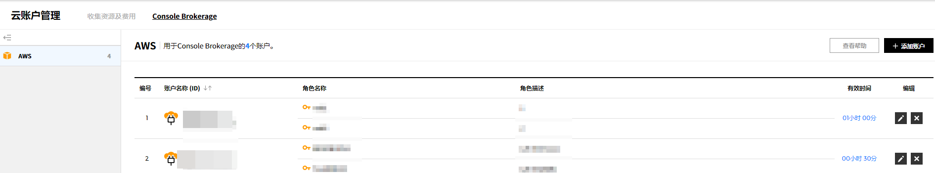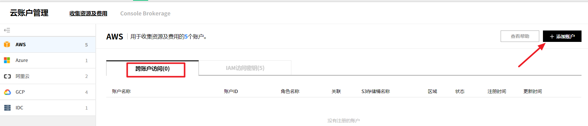 可以管理当前使用服务的汇总信息、成员权限、云账户、服务组和Console Brokerage。