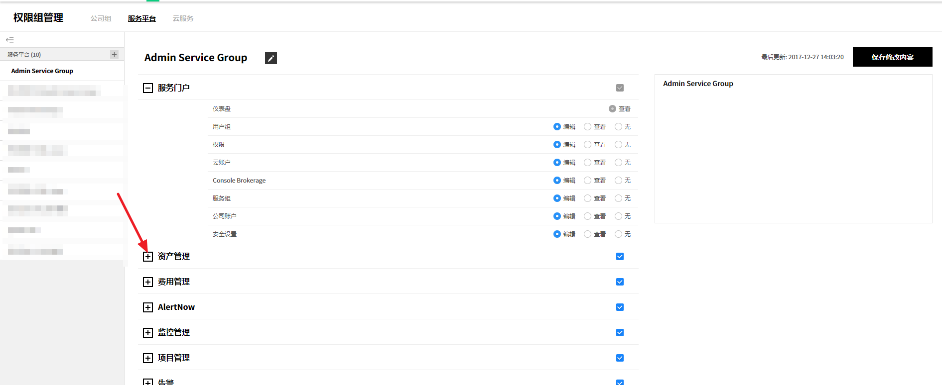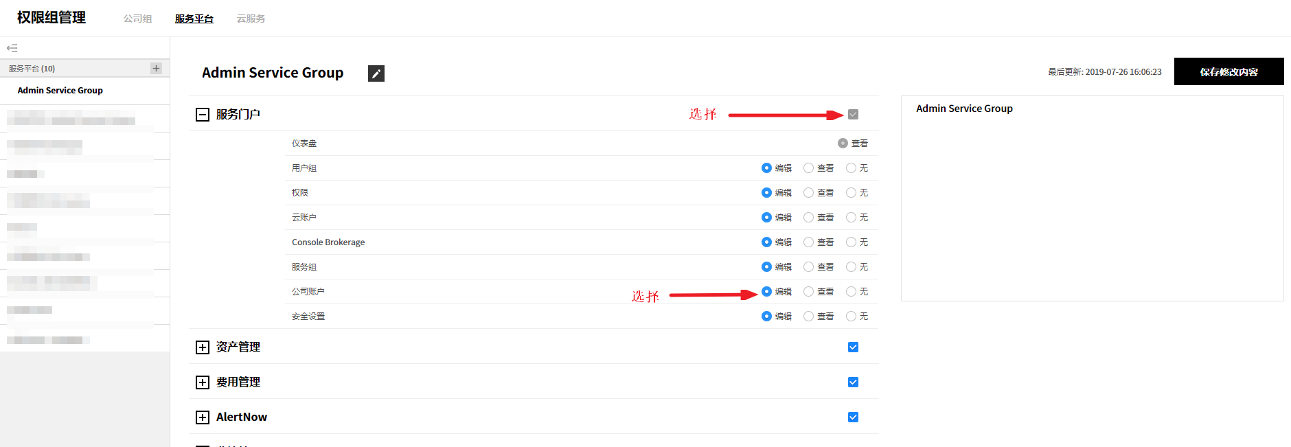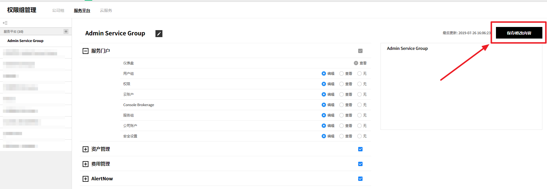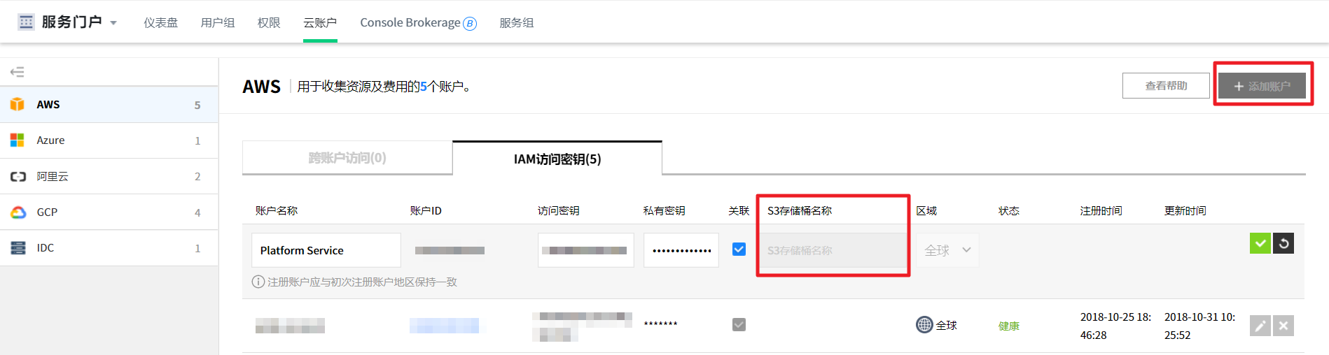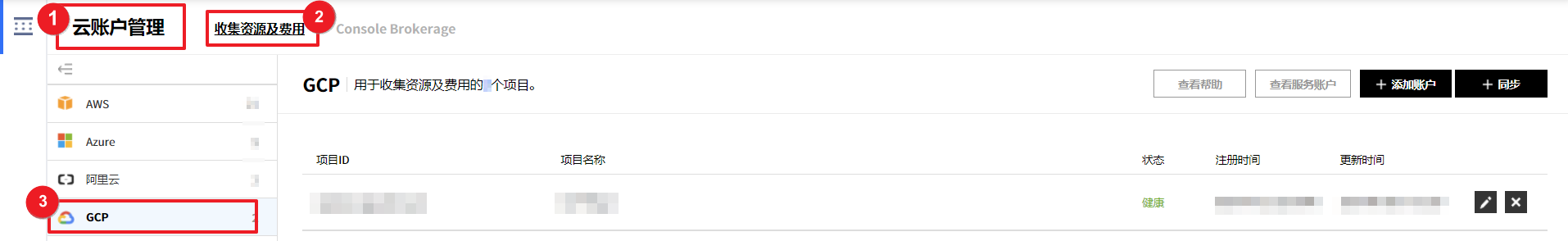 可以管理当前使用服务的汇总信息、成员权限、云账户、服务组和Console Brokerage。