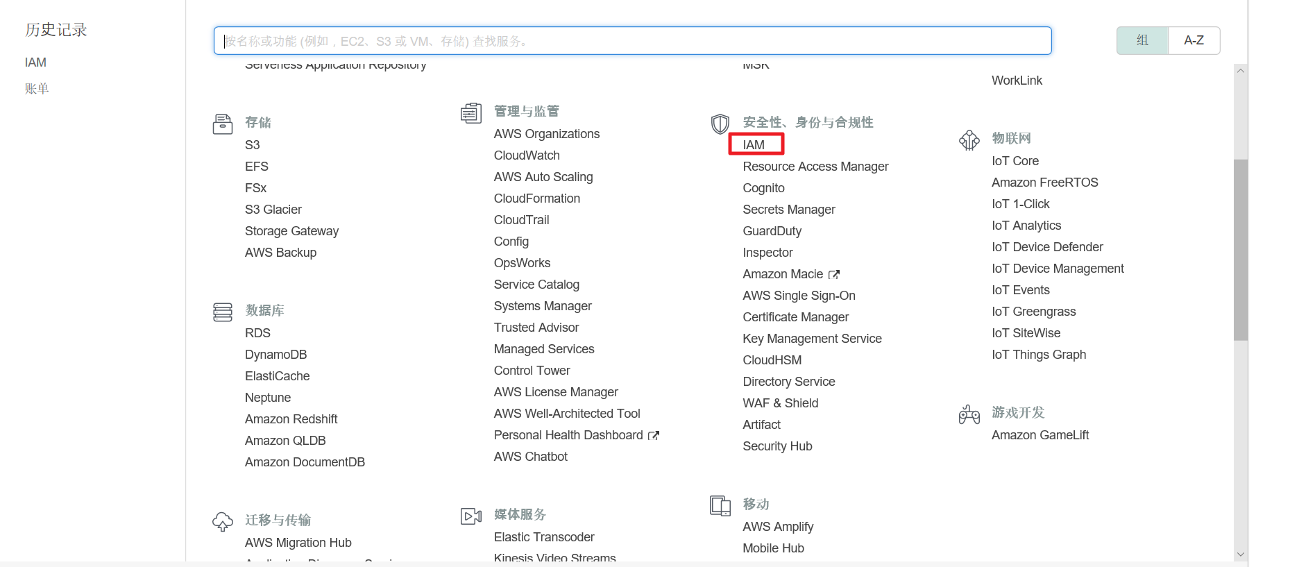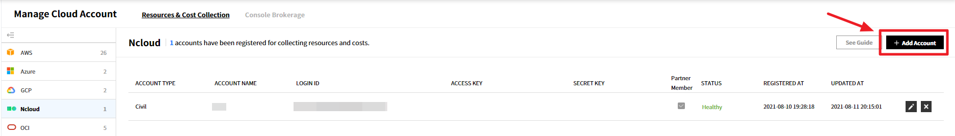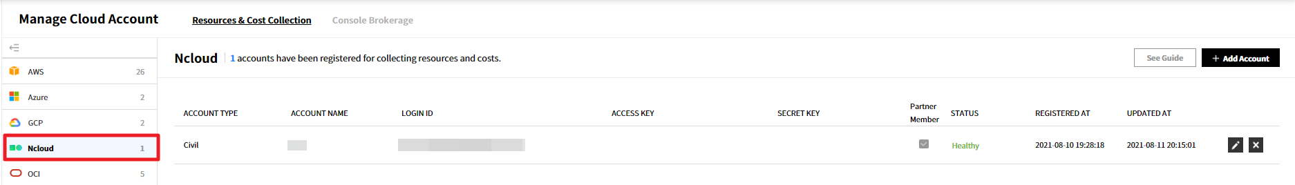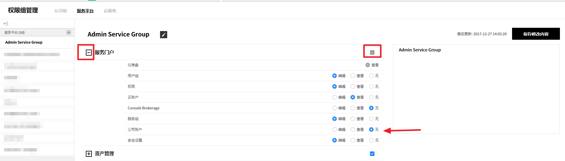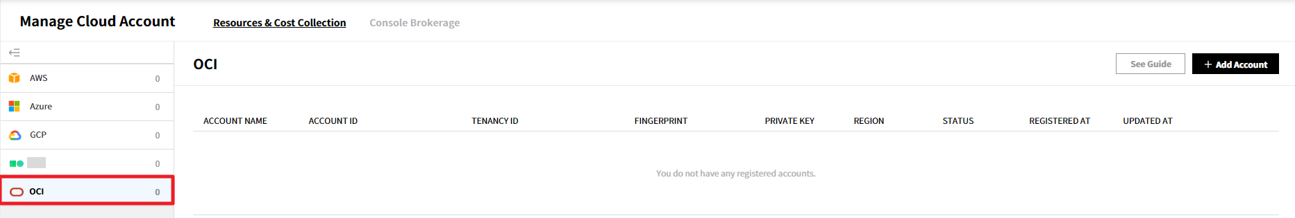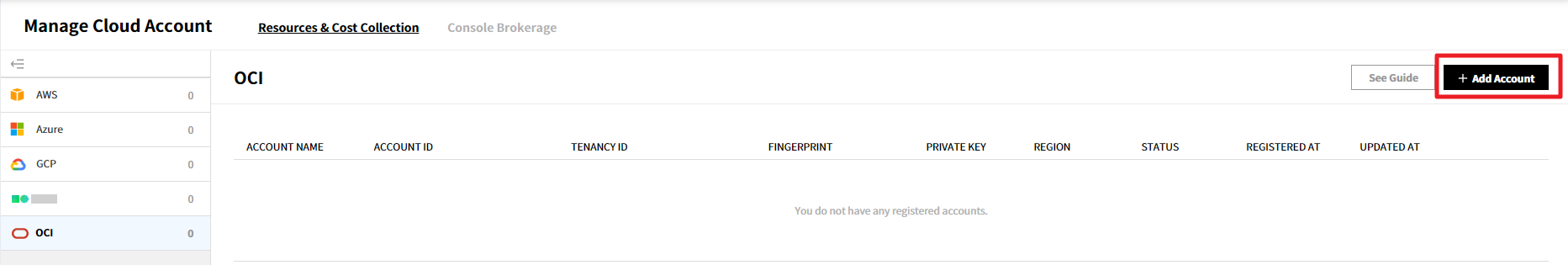 可以管理当前使用服务的汇总信息、成员权限、云账户、服务组和Console Brokerage。