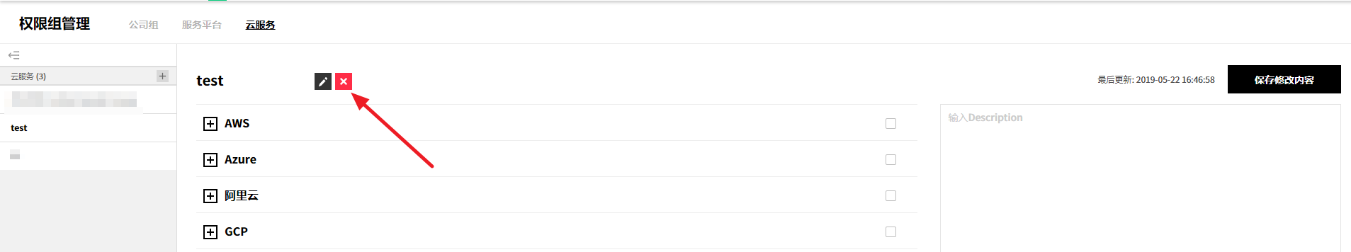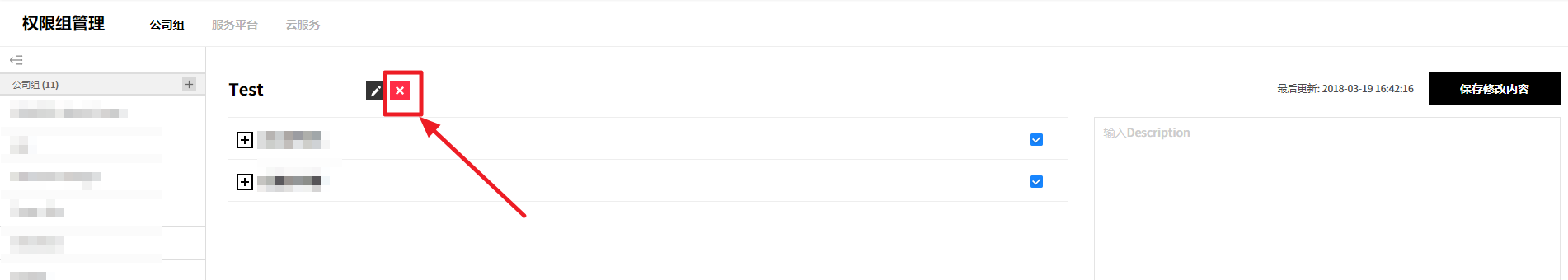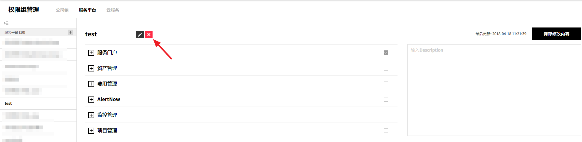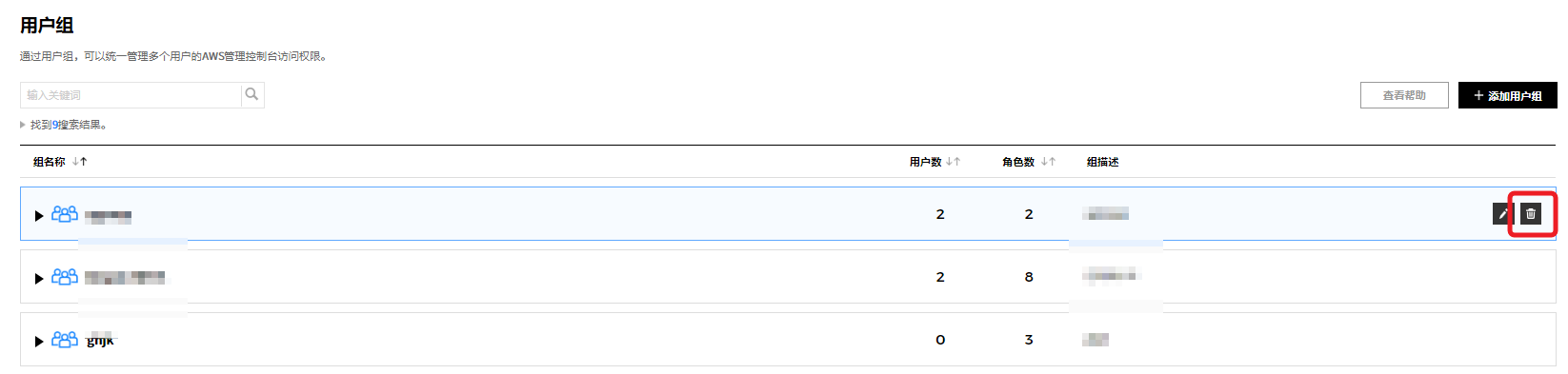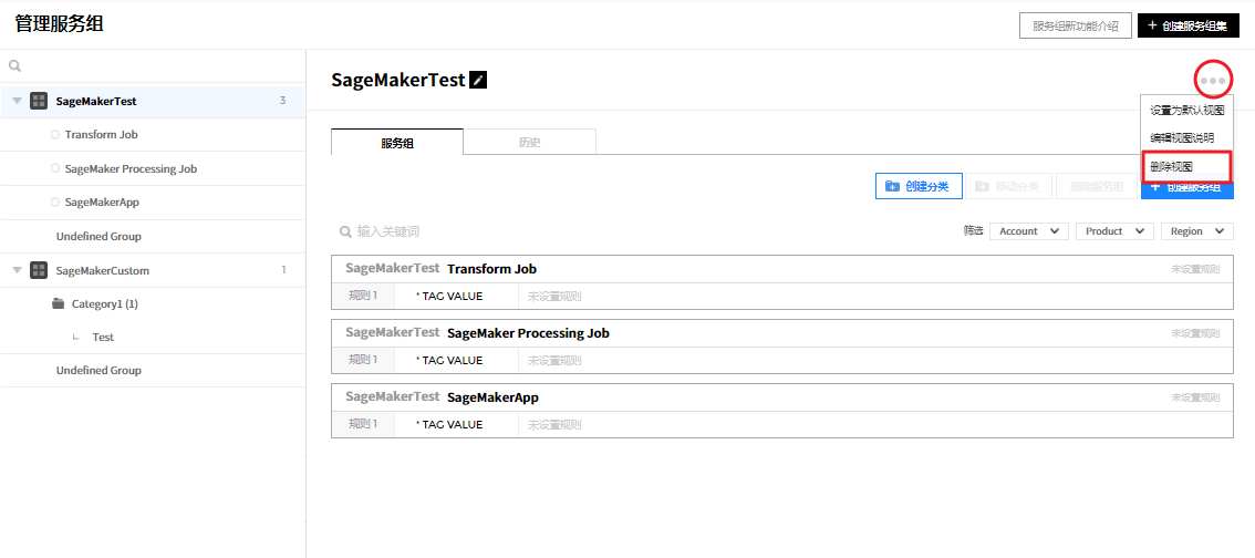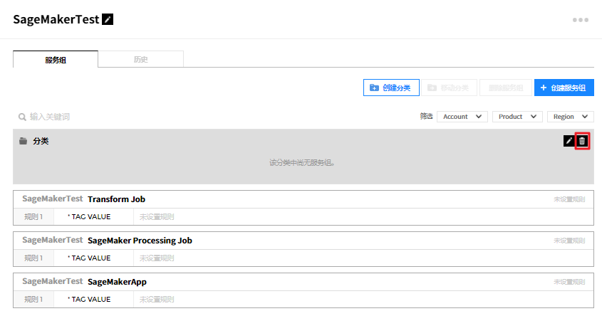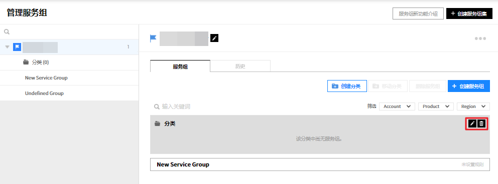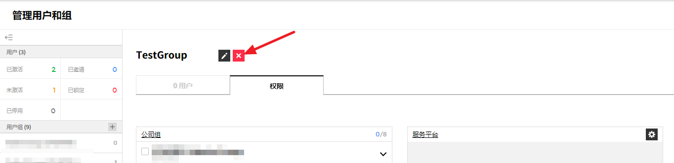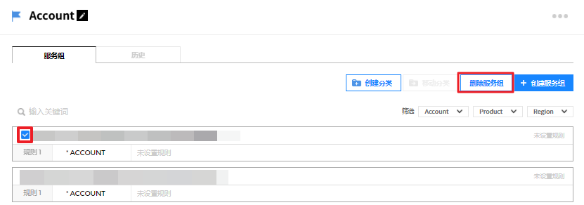 ② 或者从详信息页面中选中要删除的服务组,并通过点击右上角的删除服务组按钮来统一删除服务组,或将鼠标悬浮在要删除的服务组上,将出现编辑、删除、添加按钮。 此时,点击删除按钮将其删除。