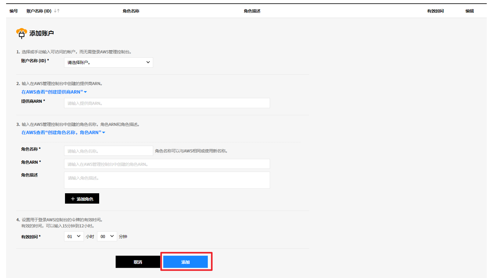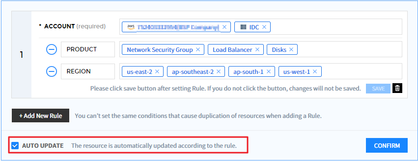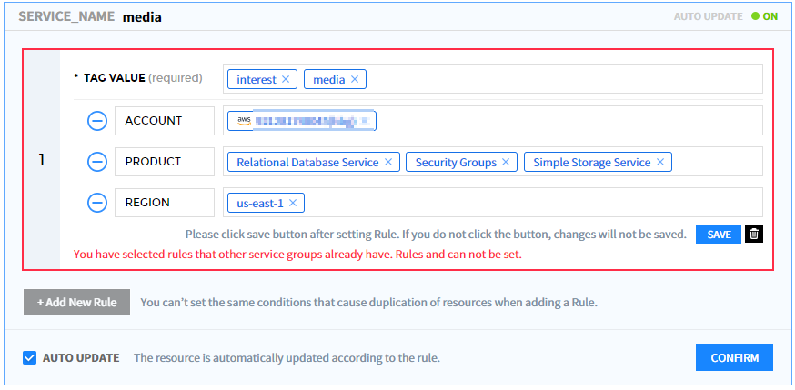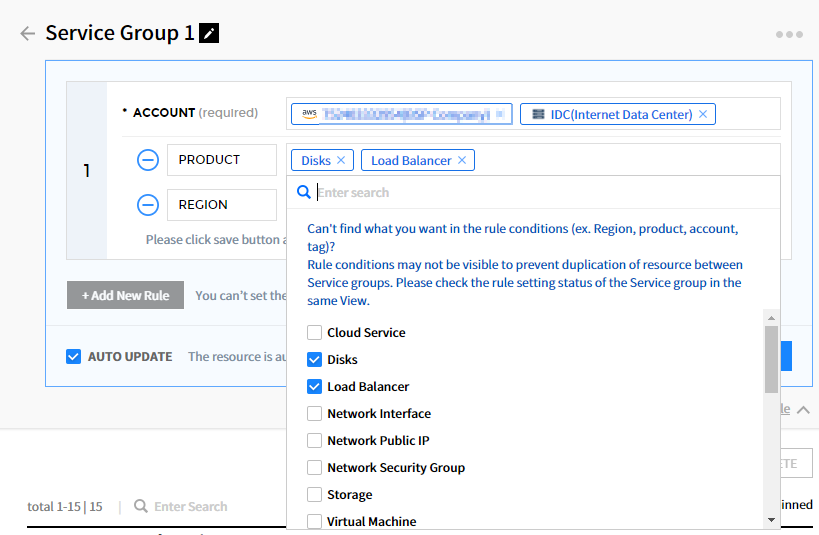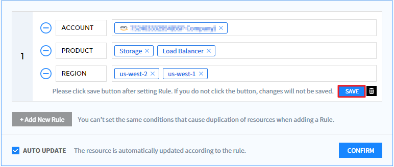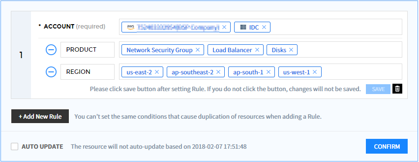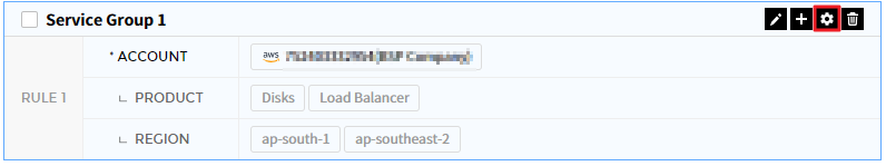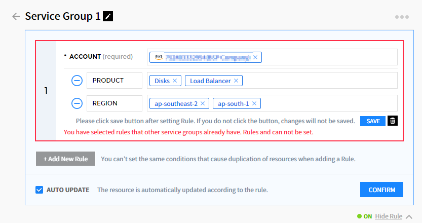 ④ 选择【添加规则】按钮以展开列表并显示设置选项。 若有已设置条件,则将一起显示。如果未选择账户条件或在另一个服务组中设置了重复条件,则显示告警消息并且不保存。