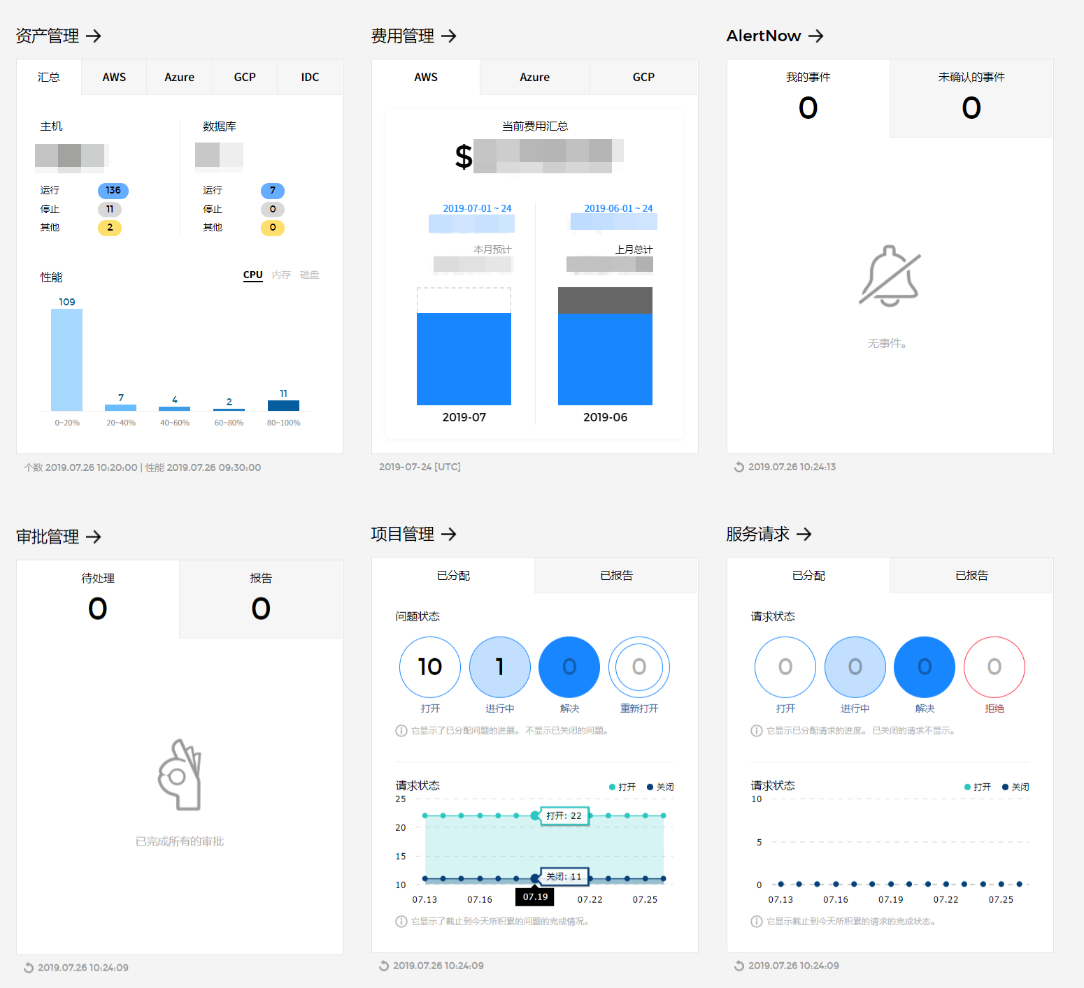 无需跳转到资产管理页面,可以直接从仪表盘查看当前云服务、基础设施资源的使用量及性能等信息。