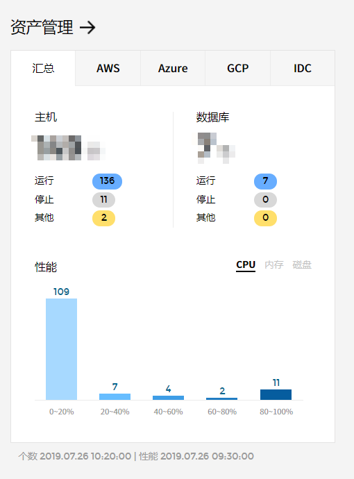 点击上端的汇总选项卡,可查看所有运行中的多云和混合环境的主机、数据库使用数量和根据性能的数量分布。 - 各云服务信息