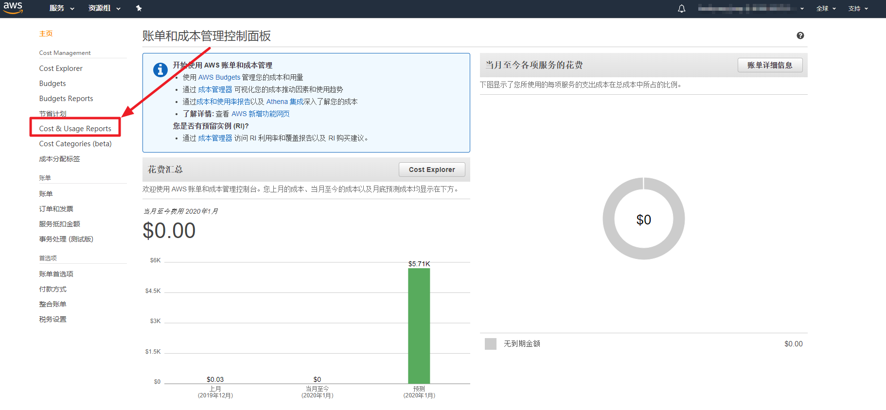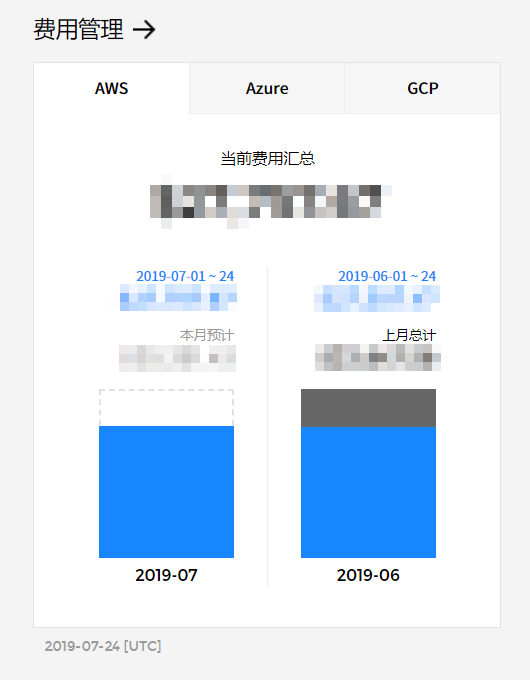 可以查看AWS,Azure和GCP等各云服务的已产生费用,点击各服务选项卡, 以查看当前费用和预计费用。