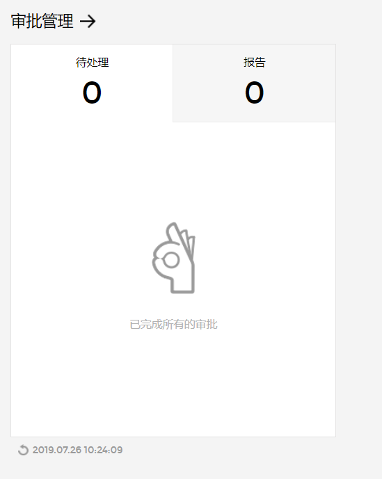 点击审批管理卡片视图上端的箭头,则将转到审批管理仪表盘页面。 - 已报告/待处理