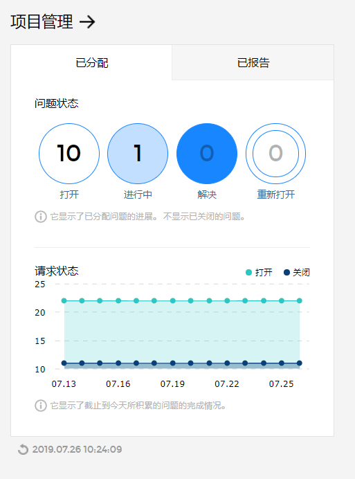 在项目管理中,可以按项目或团队注册任务,并管理已注册任务的历史记录。 用户可以确认已报告的问题和分配到自己的问题,可以通过数据及图表确认问题的状态及情况。