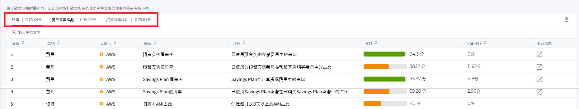 | 使用权重分数 | 显示当前使用中的效率指数项所使用的权重分数。可在效率指数管理页面中设置权重。 | 权重分数 =标准分数 × 设置权重/100 |