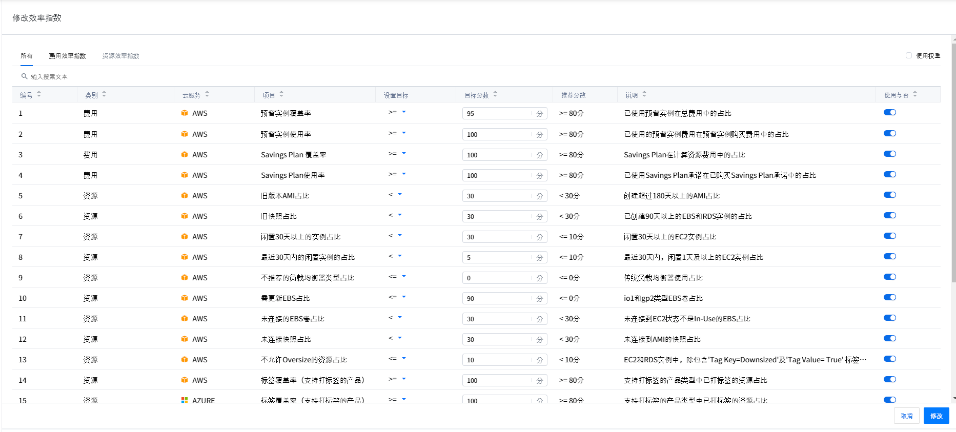 可以通过选择费用或资源项有效管理云效率指数。可以根据用户IT环境定义费用和资源的各效率指数项评分标准进行指数管理。