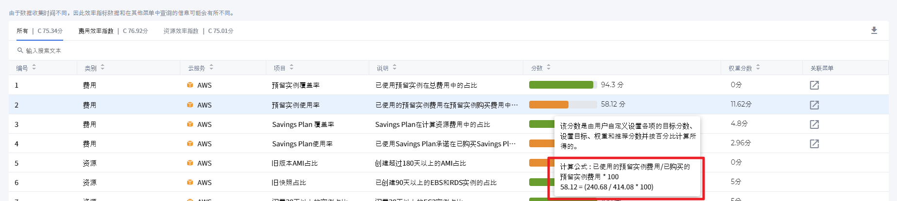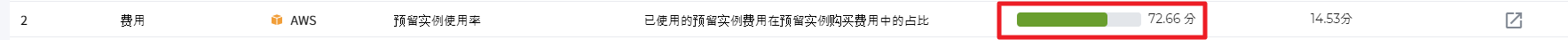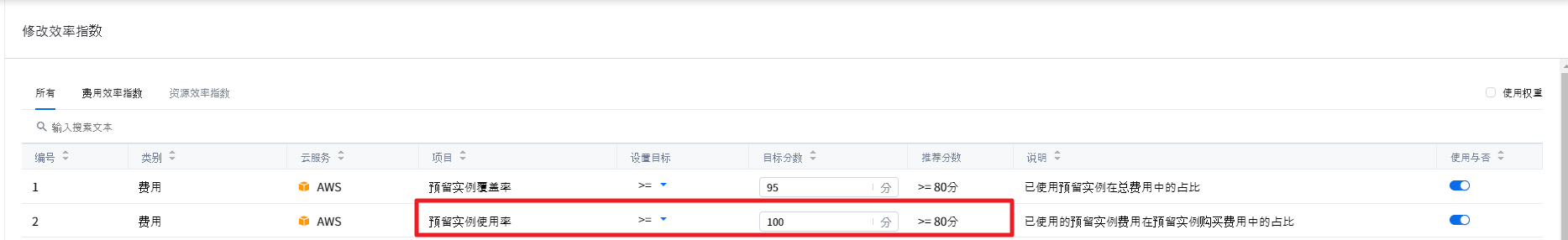 ▶ 计算条件: 在效率指数管理页面中将预留实例使用率的设置目标设置为>=,目标分数设置为100并且没有使用权重。