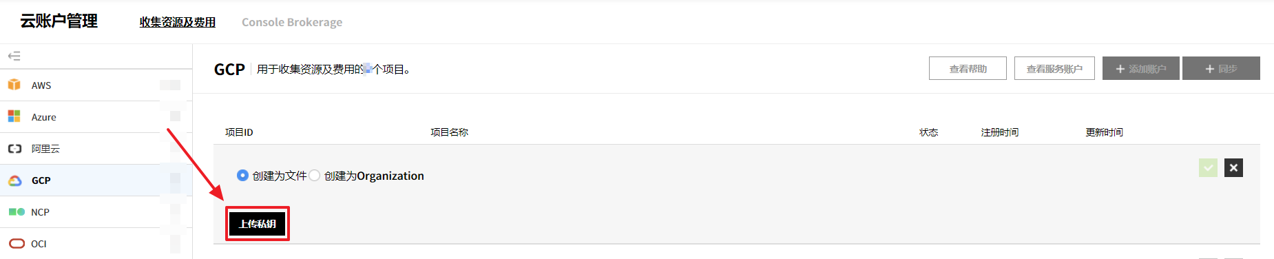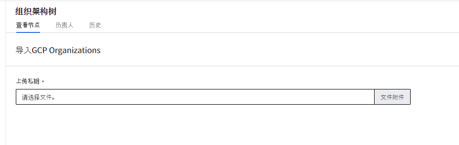 如果您正在使用GCP Organizations 服务管理您的账户,则可以加载GCP Organizations并在组织架构树中监控费用。点击查看更多按钮,从下拉列表中选择导入GCP组织按钮,然后在下一页面中上传您的私钥。点击创建按钮以设置新的组织架构树。
