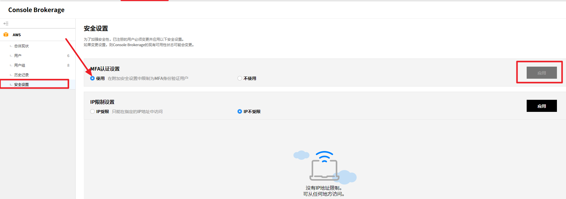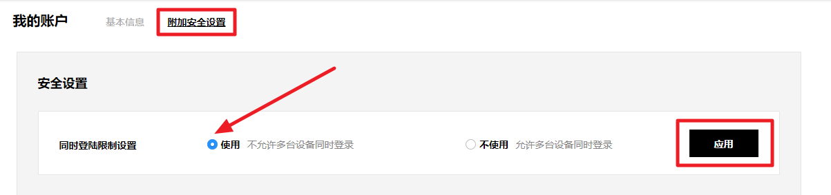 在同时登陆限制设置选择使用选项,然后点击应用按钮。