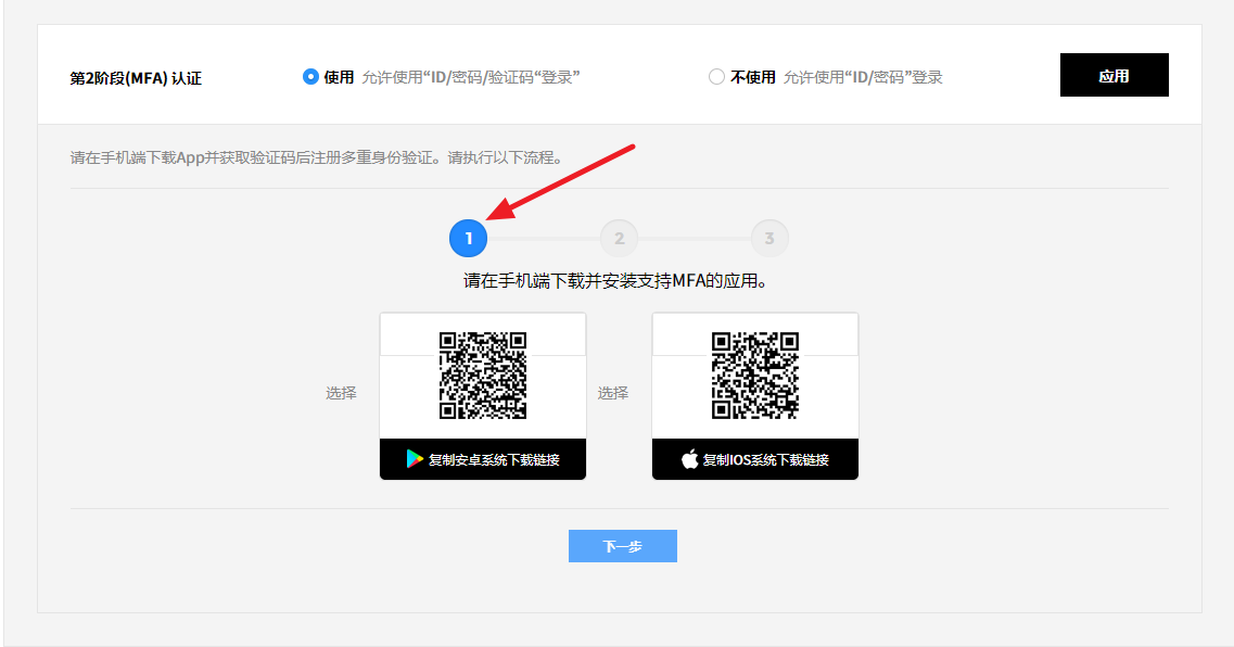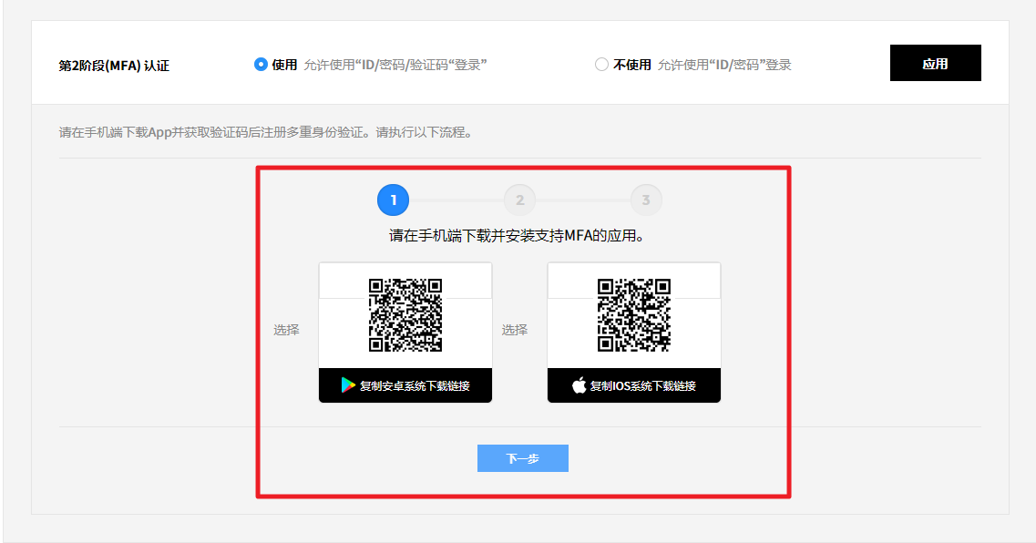 2.1. 激活第2阶段(MFA)认证项,然后点击应用按钮。 需要Admin访问权限的用户必须激活第2阶段(MFA)认证设置,无需Admin访问权限的用户是选项。