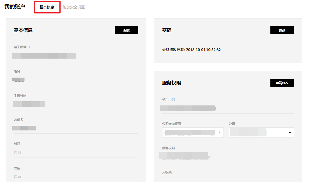 在基本信息页面上,可以查看电子邮件ID、姓名、电话号码、公司名称、授权用户组、服务权限等可查到的公司基本信息。