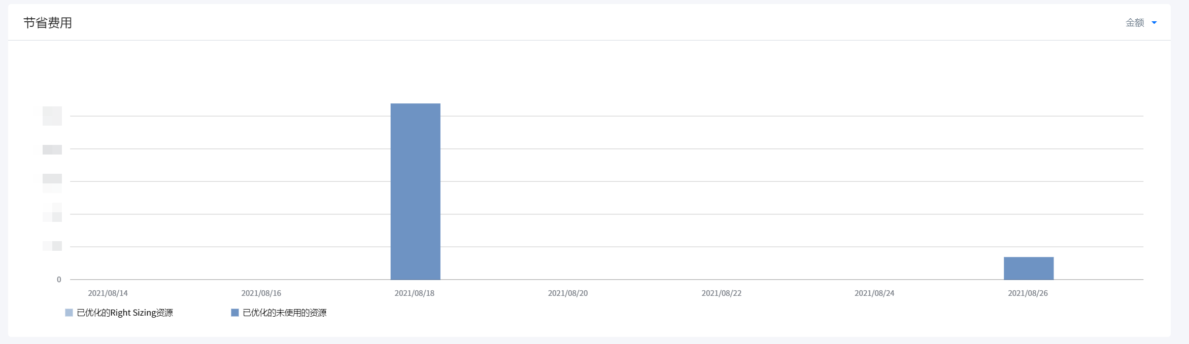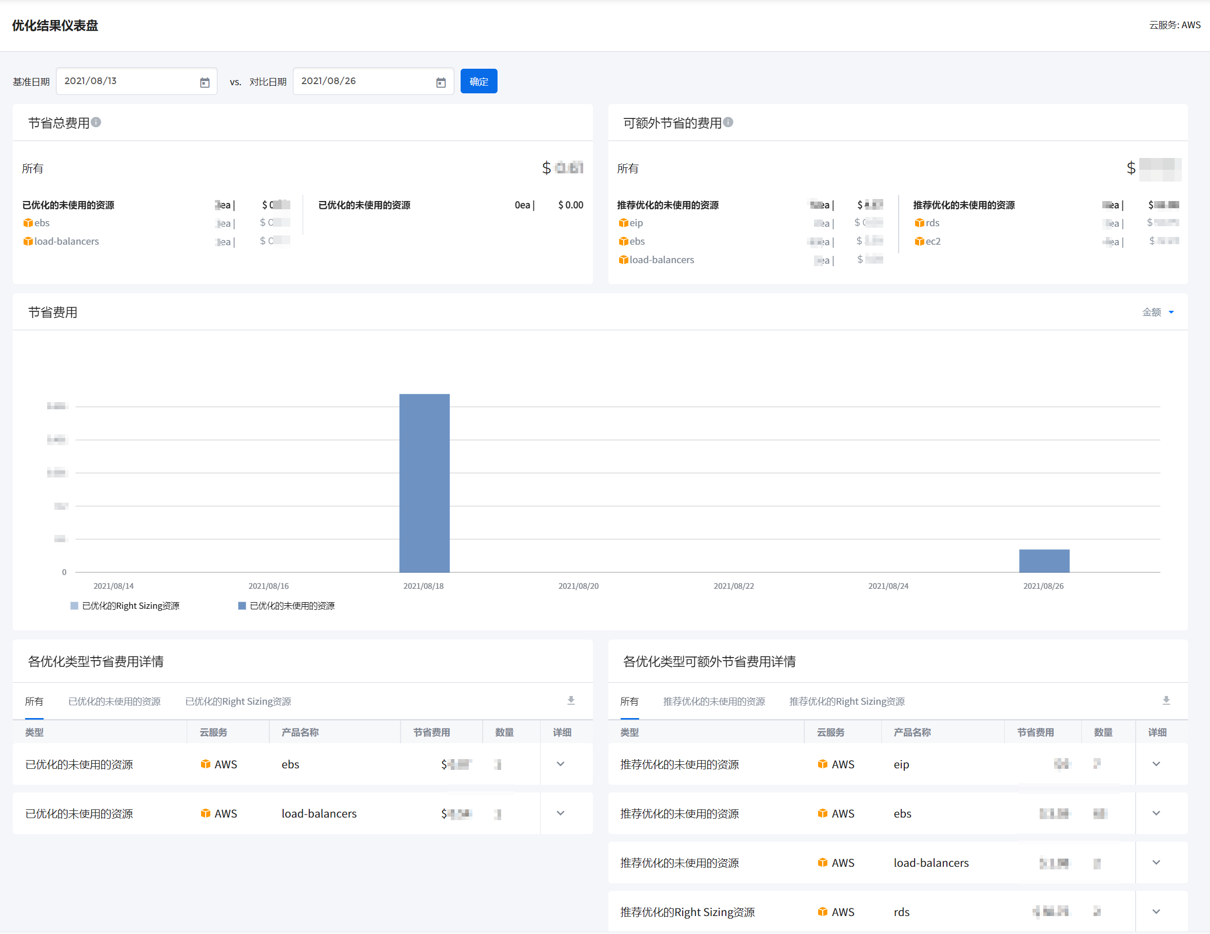 对比日期:为了解在基准日期过后,优化对象资源的优化程度,以及是否进行了Right Sizing而设定的比较日期。在下方的节省费用图表中,以矩形图的形式展示从基准日期以后到对比日期期间,已优化的未使用的资源和进行了Right Sizing的资源的金额和数量。