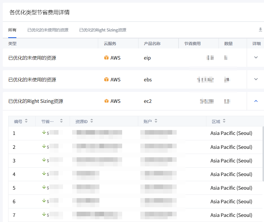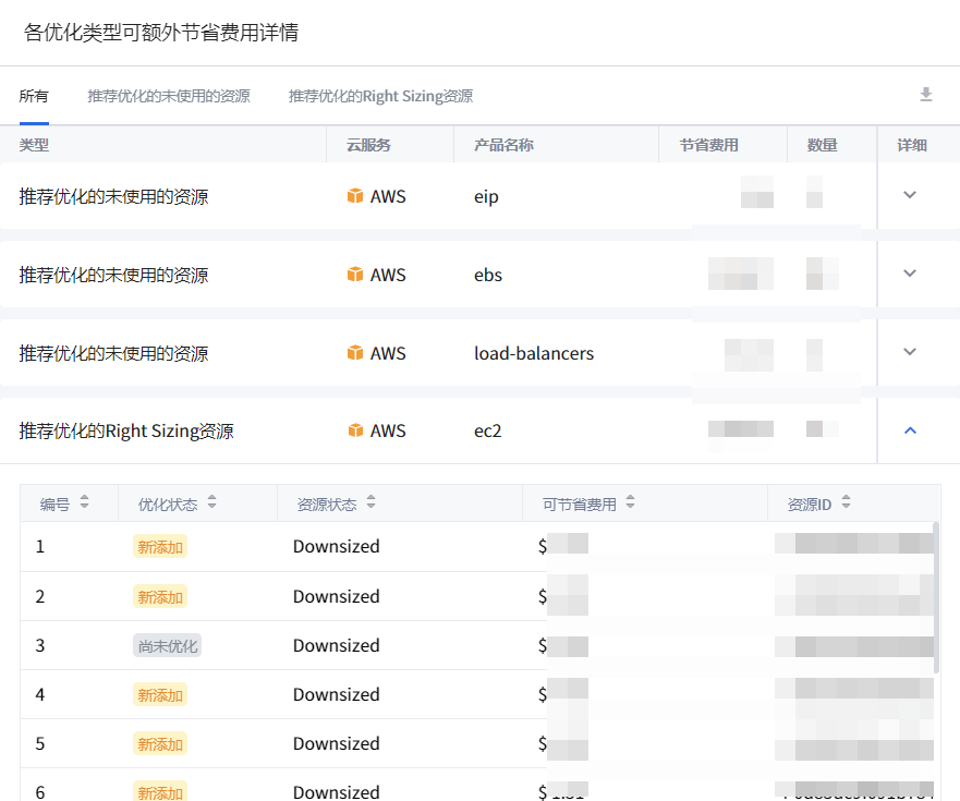 可查看Asset Management服务的资源优化菜单中推荐优化资源的优化及费用节省情况,并提供可以额外节省费用的资源的信息。