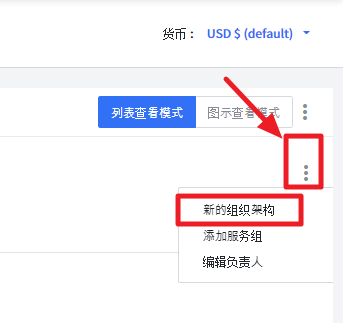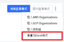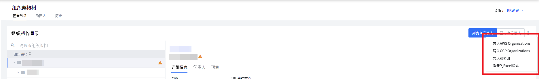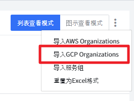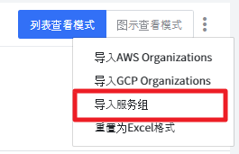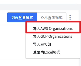 描述如何使用组织架构树。可以通过点击“更多”按钮来设置组织架构树,如下图所示。可以使用 导入AWS Organizations、导入GCP Organizations、导入服务组、重置为Excel格式 方法进行设置。