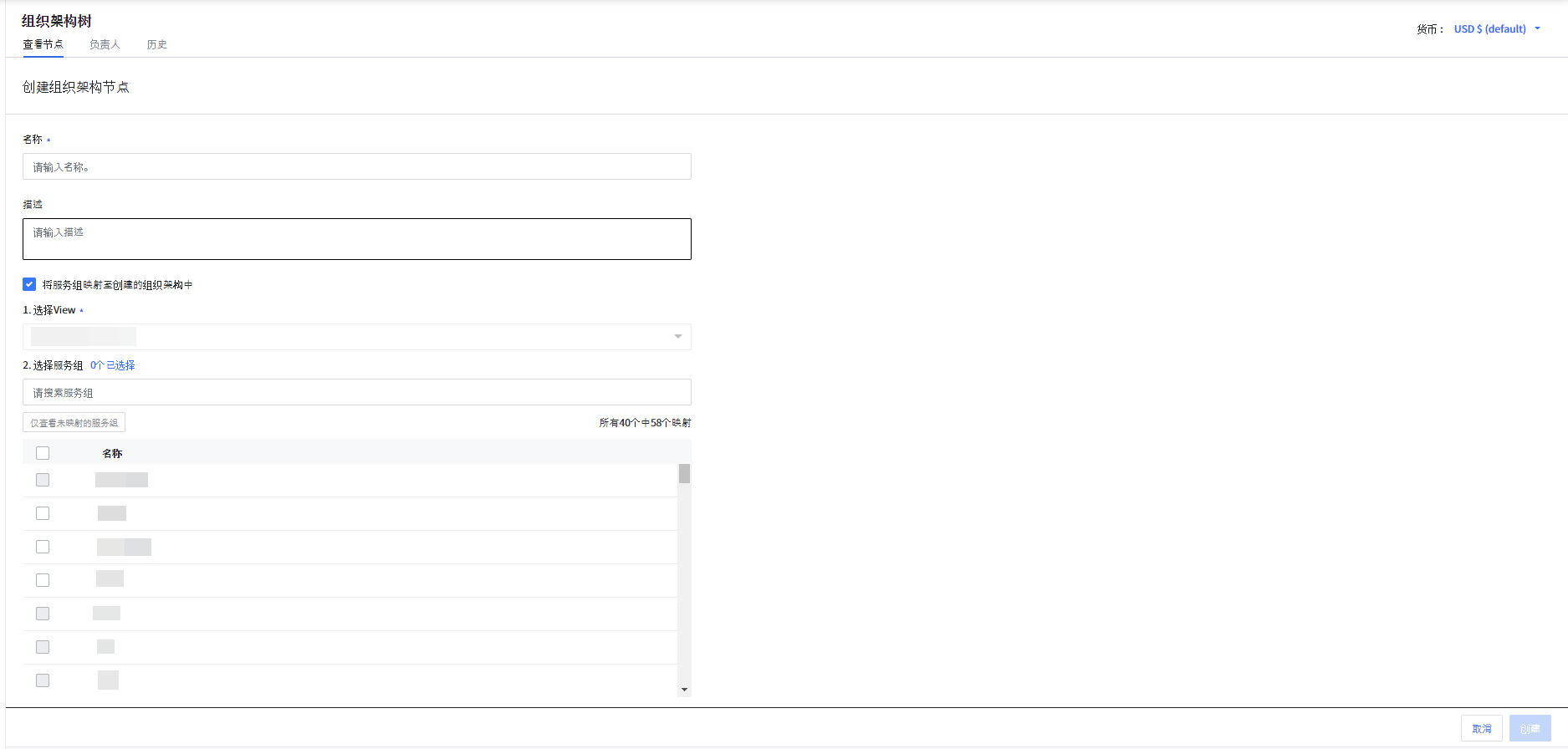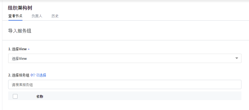 服务门户中已经有服务组的用户,可以导入服务组并在组织架构树中监控费用。点击 查看更多 按钮,从下拉列表中点击 导入服务组 按钮。然后在下一页面中依次选择View和服务组。点击创建按钮将服务组映射到组织节点。