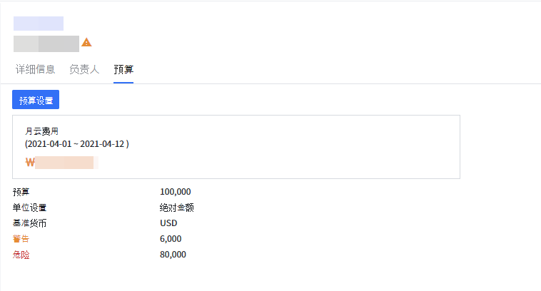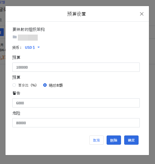 点击 设置预算 按钮后设置金额,当超出阈值将显示告警或危险风险提示。警告和危险支持设置为百分比(%)或绝对值。