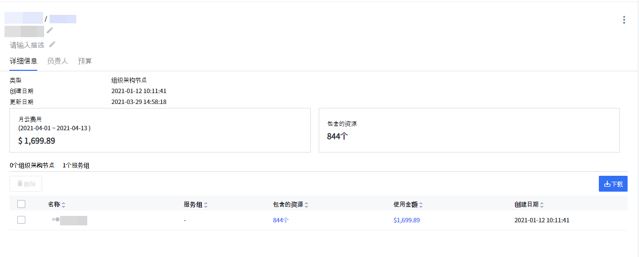 在组织架构树仪表盘中选择节点,则可以查看该节点的类型、创建日期、云费用、包括的资源数量以及子节点的详细信息。