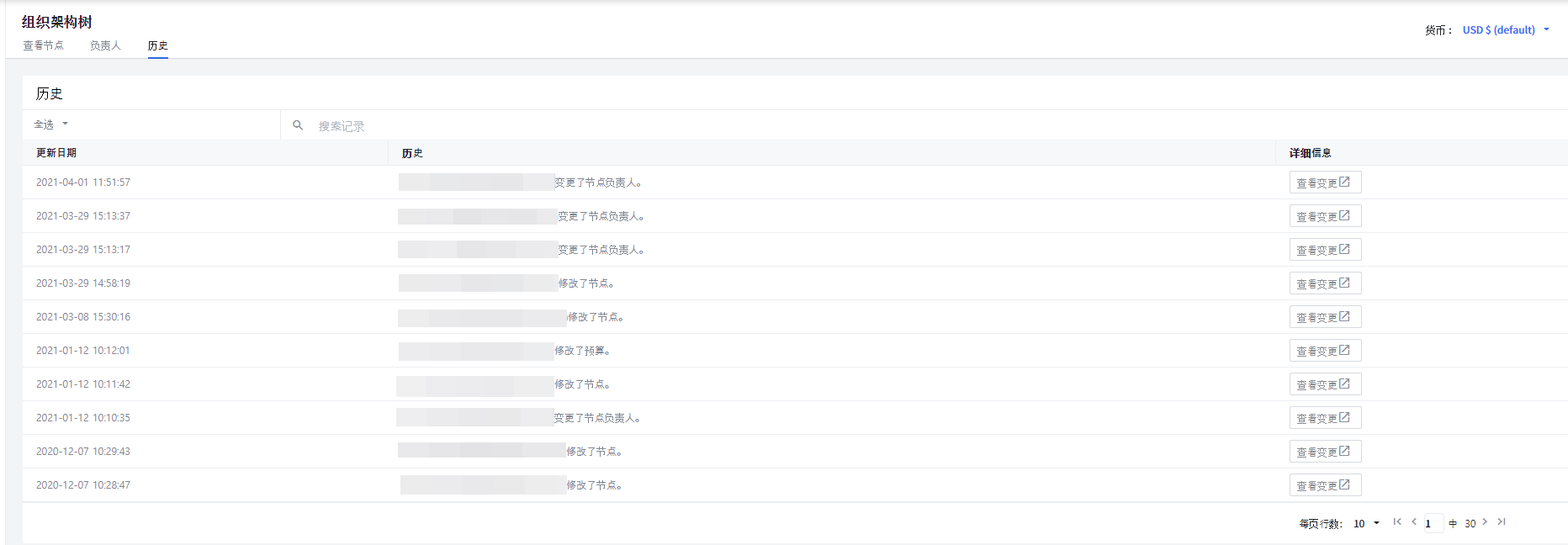 您可以检查每个节点的更改历史记录。也可以查看节点创建、修改和删除的历史记录,同时可以通过 查看变更 对比该历史记录的变更前后信息。