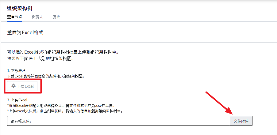 点击 查看更多 按钮,选择 重置为Excel格式 按钮。可以通过excel表单将组织架构图批量上传到组织架构树中。下载Excel文件,输入组织架构图并上传文件后,将根据Excel格式创建组织节点。
