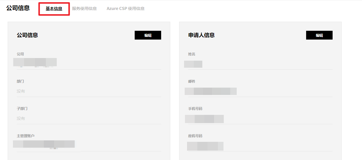 公司信息菜单提供基本信息、服务使用信息、Azure CSP使用信息及支付信息等。