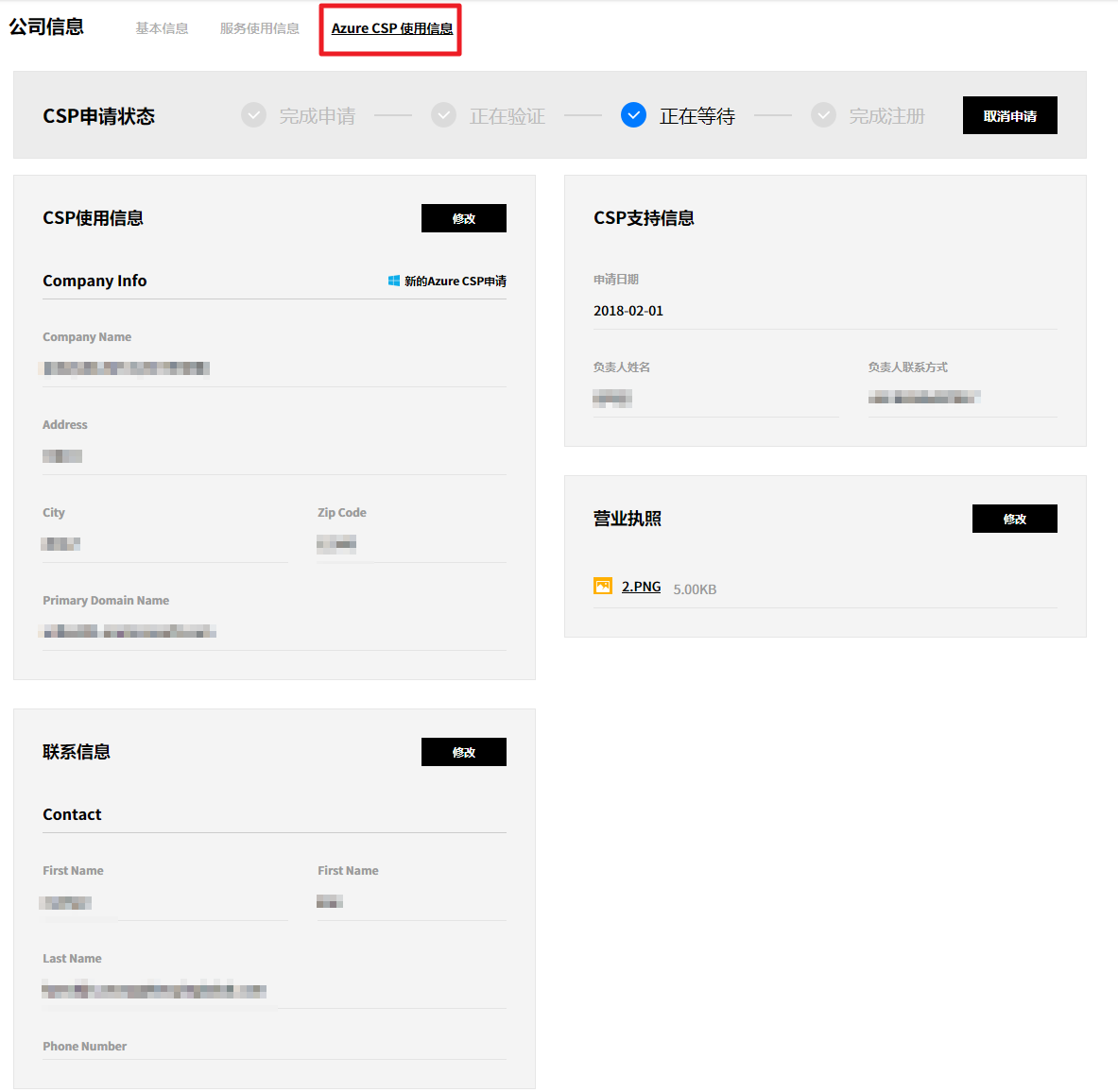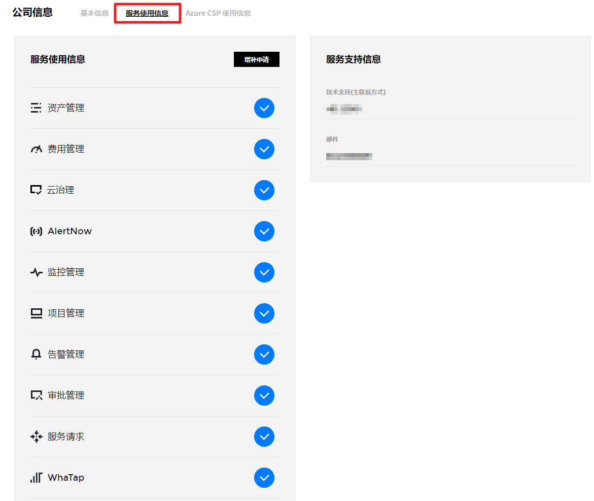 可以查看Azure CSP的基本信息,还可以检查CSP使用信息,CSP支持信息,联系方式和CSP申请状态。