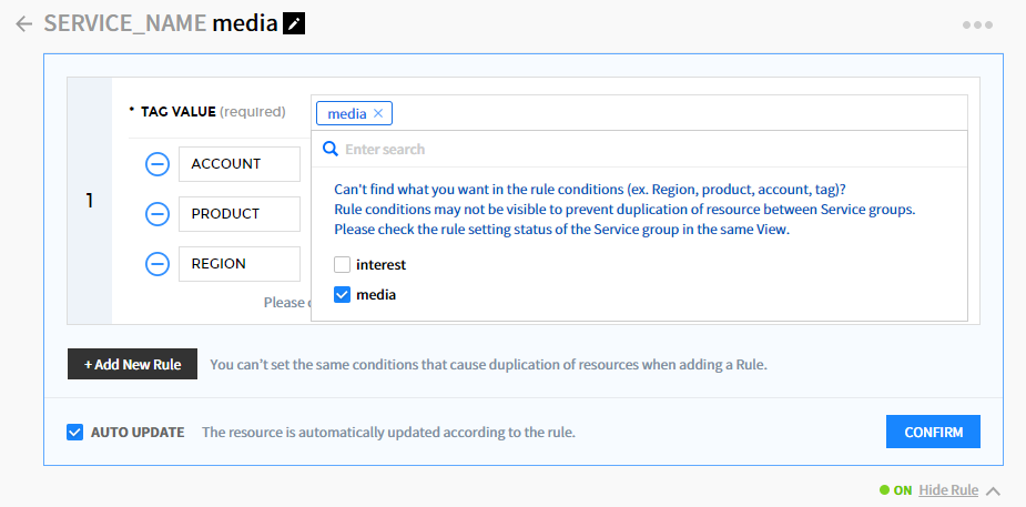 在自动更新OFF的状态下,不再根据规则条件对资源进行分类。 若再次选中自动更新并将其转换为ON状态,则会根据规则条件自动进行分类。