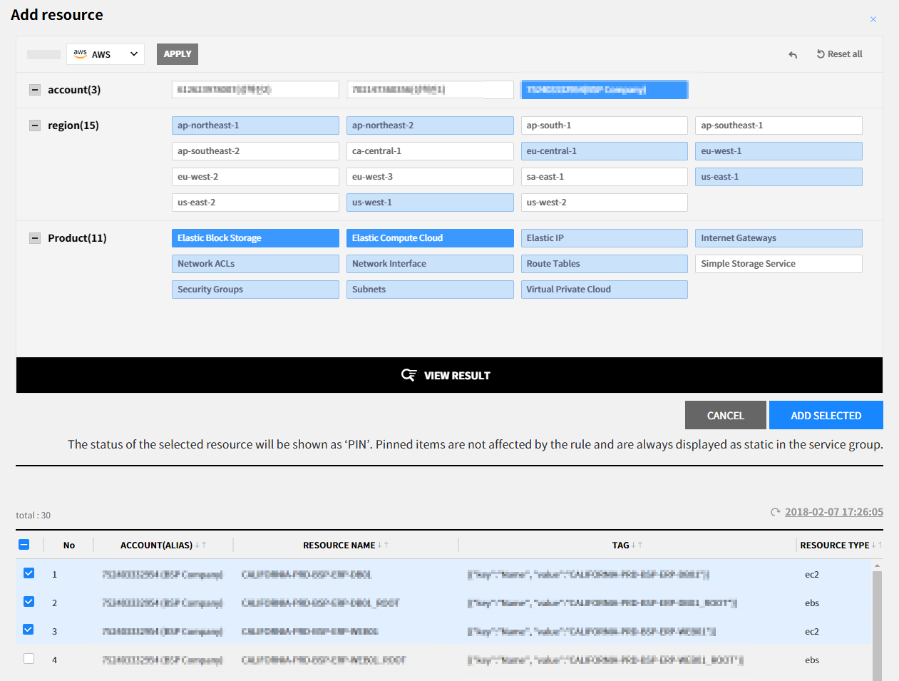 ② 使用智能搜索设置条件,从搜索结果中选择资源,然后点击【添加选择的资源】按钮。